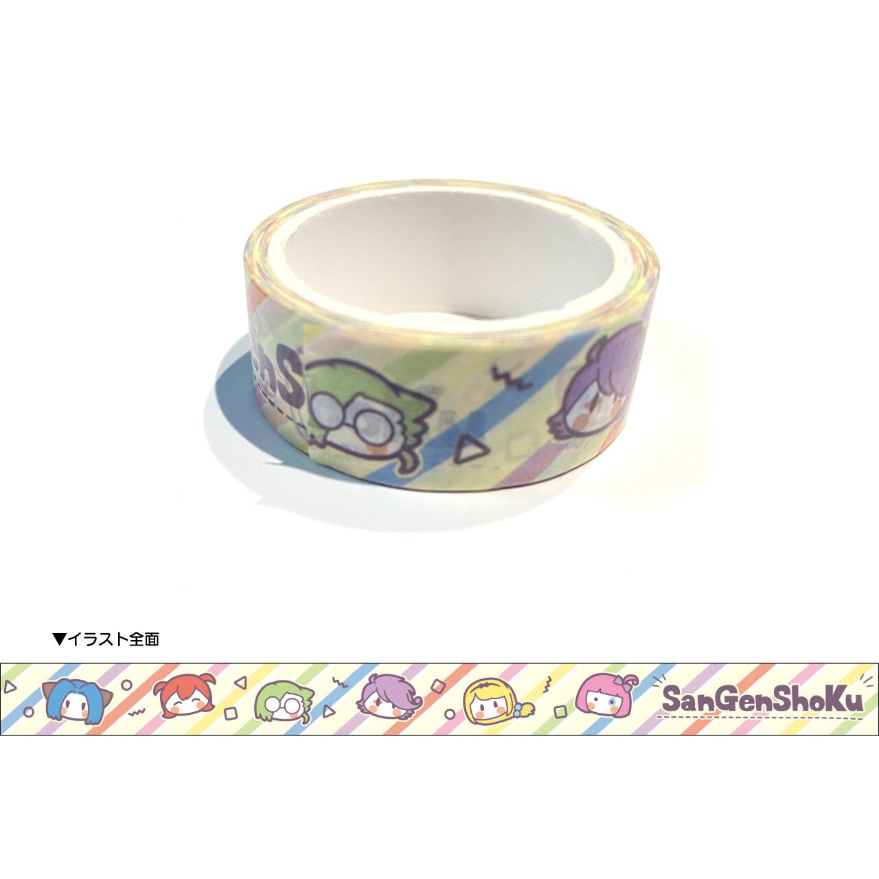 デフォルメされたサンゲンショクのキャラクターたちのお顔が描かれたマスキングテープです。